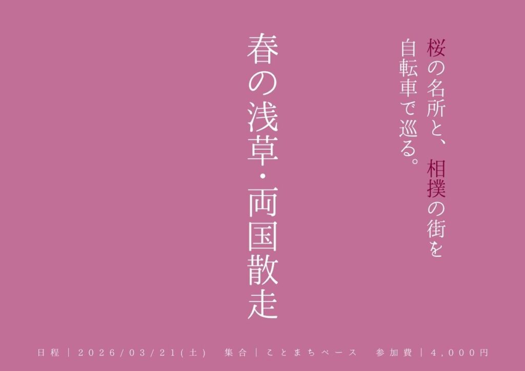 東京都墨⽥区・押上駅から徒歩すぐの「ことまちベース」にて、浅草・両国エリアを⾃転⾞で巡るサイクリングツアー「春の浅草・両国散⾛」を開催します!