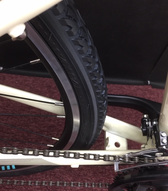他のクロスバイクよりちょっぴり太めなタイヤで、細いタイヤに不安があるスポーツバイク初心者にも安心。