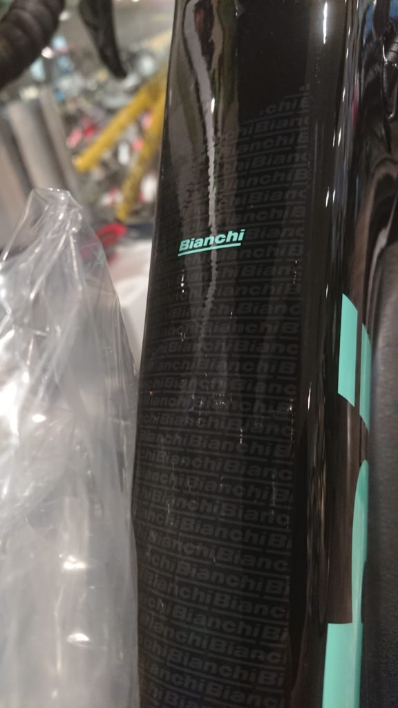 ストレートチューブメインで構成され、シンプルなカーボンロードです。リヤ三角が小さく最近のロードな感じがよいです。フレームにBIANCHIのロゴが細かく無数に散りばめられており、クールな1台ですね。
