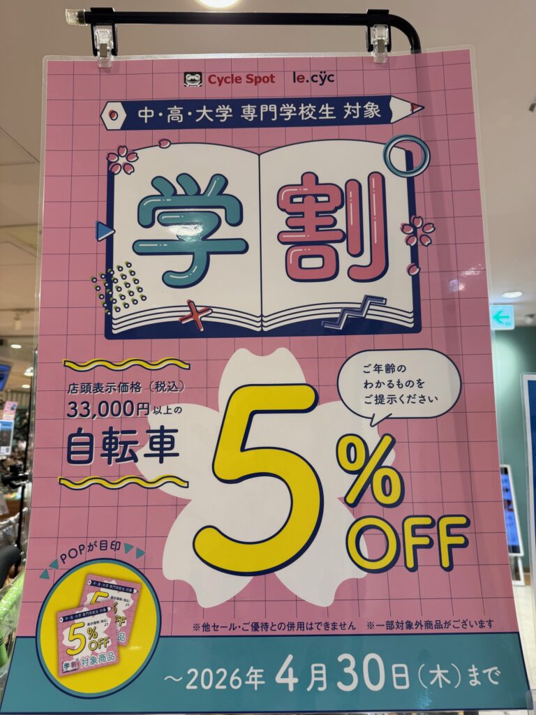 33,000円(税込)以上の自転車は5%OFF !!(学生証の提示をお願いします。)