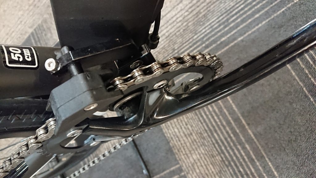 フロントがシングルギアですが、後ろはロードバイクのクラリスコンポが装備されています。