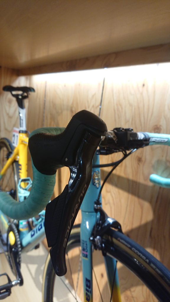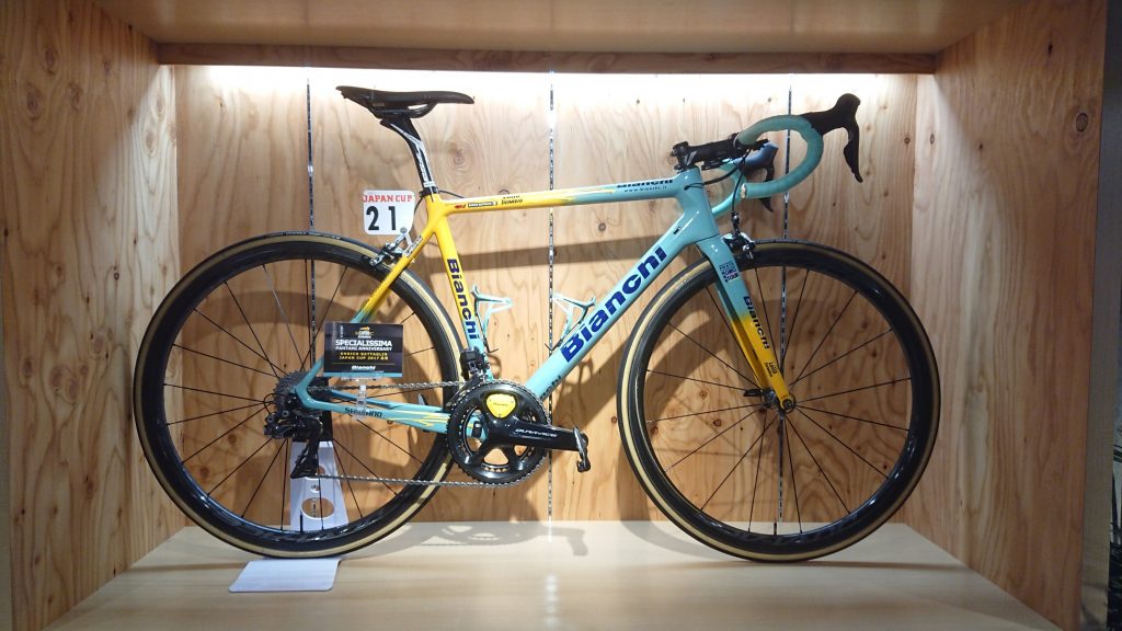 ジャパンカップという日本国内最大級のロードレースにて、エンリコ・バッタリン選手が実際に使用した車体を、今回ビアンキコーナーに展示しております。
