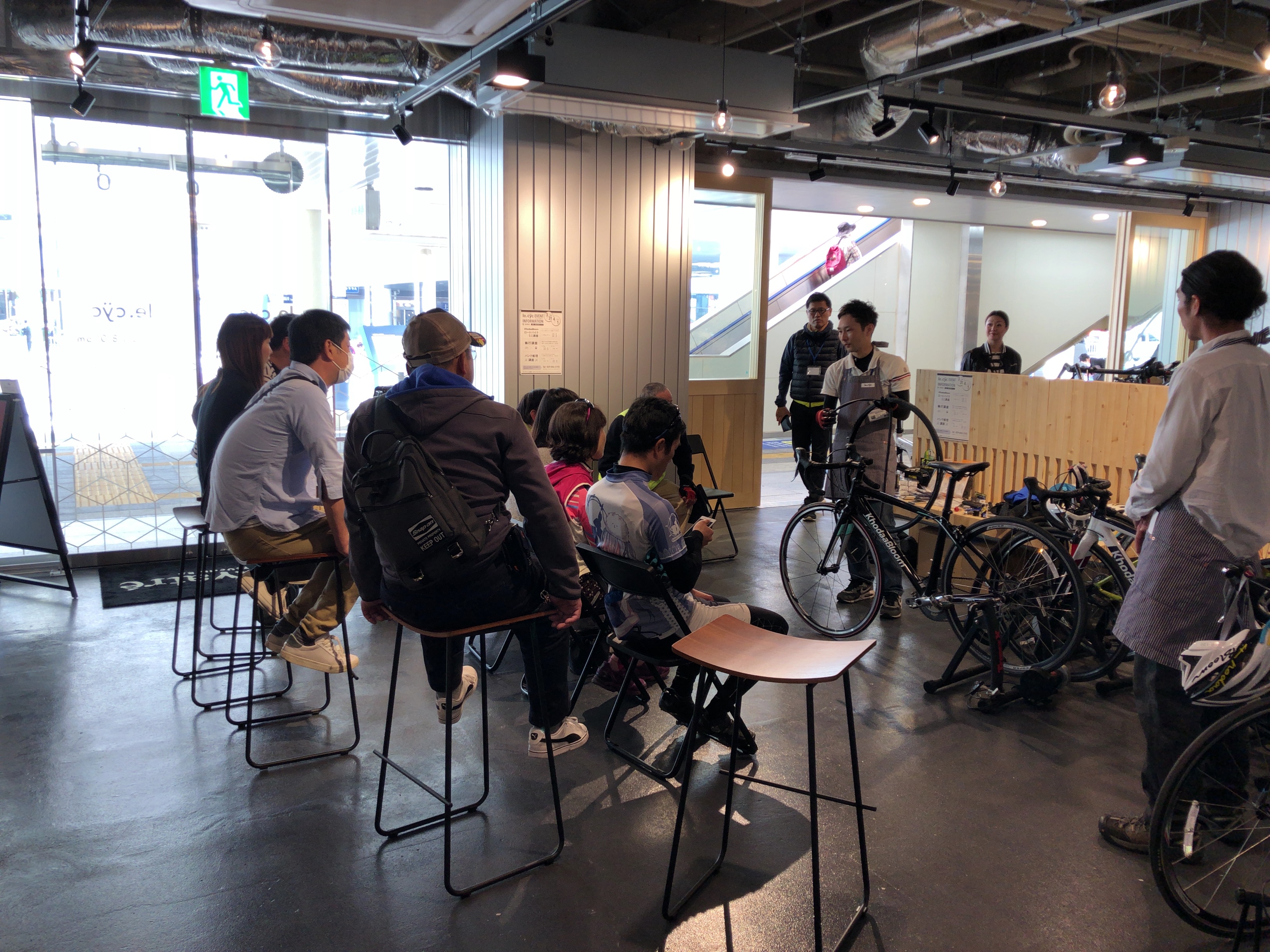 初心者向けロードバイクミニ講座は、乗りかたの練習を店内で行います。