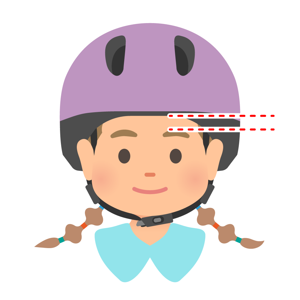 ①おでこが隠れるように、ヘルメット前側のラインが眉の上あたりにくるよう被ります。