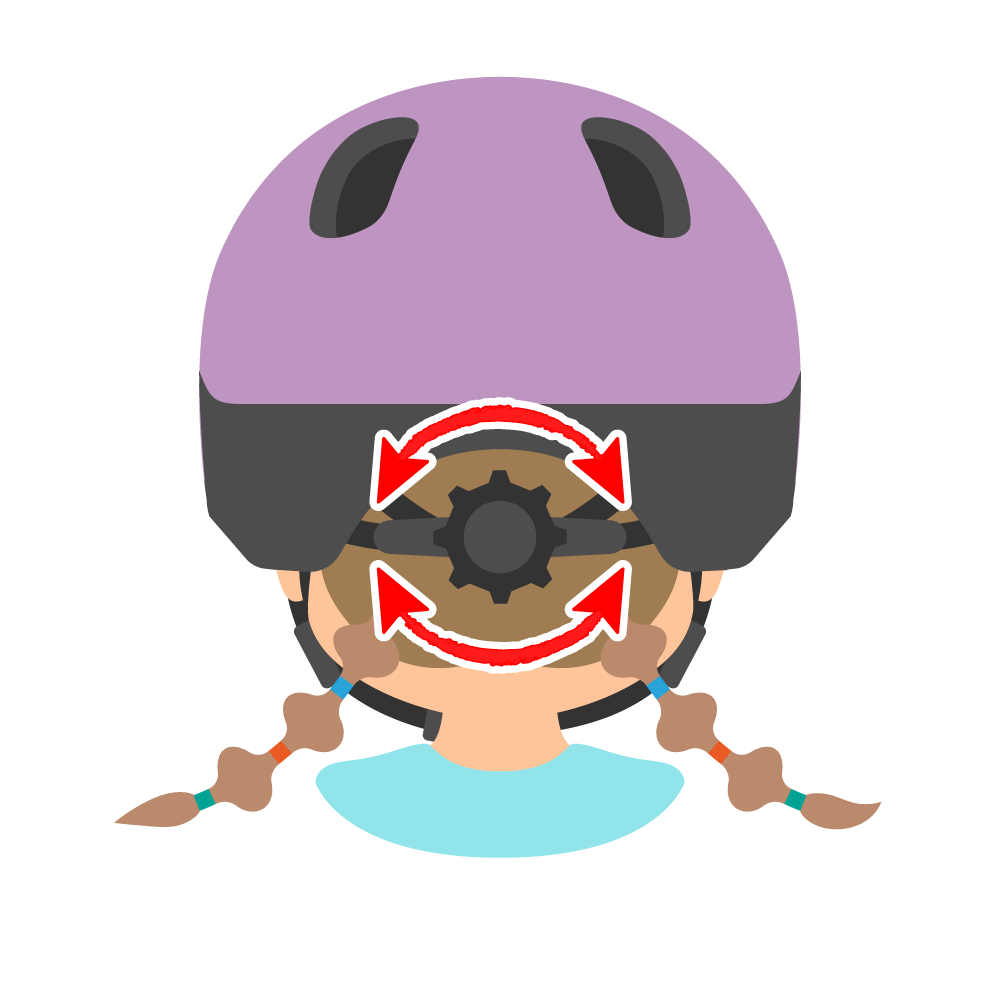②ヘルメット後頭部あたりの調節ダイヤル、