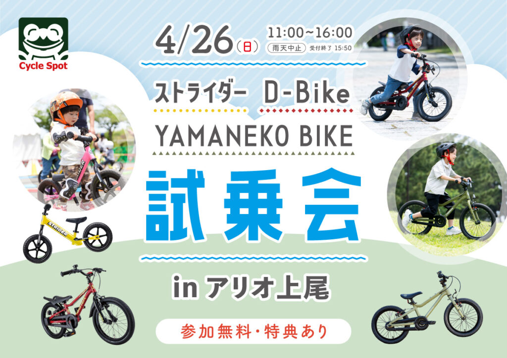 2026年4月26日(日)サイクルスポットアリオ上尾店にて「ストライダー&ディーバイク&ヤマネコバイク試乗会」を開催します!